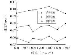 通過離散元模擬,得出了在不同轉(zhuǎn)速下的 3 種 不同螺旋葉片形狀對平均軸向速度變化趨勢,如圖 5 所示。 考察近軸處 12.75 mm 以內(nèi)圓柱的平均軸向速 度,在螺旋轉(zhuǎn)速小于 1 600 r/min 時,隨著轉(zhuǎn)速的增加, 對于直線型、折線型的螺旋葉片,其平均軸向速度成 增大的趨勢,但曲線型的螺旋葉片,其平均軸向速度 沒有明顯的變化趨勢,且其軸向輸送速度遠小于直 線型、折線型母線的螺旋葉片對應(yīng)的平均軸向速度; 但當螺旋轉(zhuǎn)速大于 1 600 r/min 后時,曲線型母線的 螺旋葉片對應(yīng)的平均軸向速度超過了直線型、折線型母線的螺旋葉片的平均軸向速度,且直線型母線 的螺旋葉片的平均軸向速度有所減小,因此,在考慮 較大螺旋轉(zhuǎn)速下,曲線型母線的螺旋葉片具有的輸送效果,能夠減小一定輸送量中的輸送功耗,提 高輸送效率。